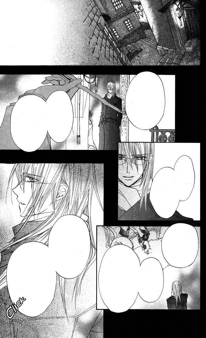 Zero continues to drink Yuki's blood. Yuki realizes that she's scared of how Zero, a vampire, is drinking her blood. She wonders why she's scared, as it's for Zero's sake. Zero then releases himself from her, calling himself a beast. He tells Yuki that he can't control his blood lust, even if he hates vampires and even if he doesn't want to hurt anybody. He sadly tells Yuki to just give up on him. He adds further that the affects of Yuki's blood can help him only temporarily, making it just as useless as the blood tablets. Yuki tells Zero that he's cruel for wanting her to give up on him. She says that she'll keep his promise and kill him if he goes berserk. However, Yuki then says that she will tame Zero's vampire side even if he will hate her for it. He hasn't lost his sanity yet so she won't let him die. Zero then asks Yuki how he can hate her, surprising her. When he asks her if something's wrong, she says that she's fine and that she can go to school again. Yuki then asks if Zero can come to school the next day.