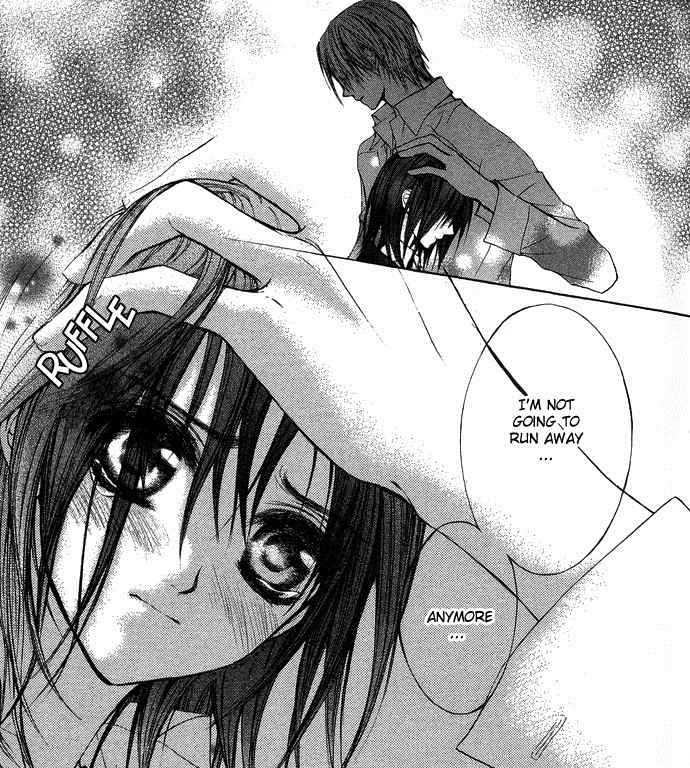 The next day at school, she thinks about her proposal. Yuki know that it's forbidden as she's offering her own blood to keep a vampire alive, and is determined to keep it a secret. She encounters Kaname, asking where she's been. Yuki asks about the Night Class lessons and Kaname says that he's finished, so everyone's left. Kaname asks to visit Kaien but Yuki informs him that he's not in his quarters. Kaname then walks over to Yuki and notices that her hair is damp, asking her if she's washed it. Yuki realizes that he knows the truth and silently begs him not to look at her neck as he's gently touching it. Much to her surprise, Kaname hugs Yuki and wonders when she's started keeping secrets from him, noting how it's all that's changed in their relationship within the past ten years. Kaname lets go. They bid each other a good-night and Yuki leaves, wondering why her heart is aching despite wanting to keep her promise with Zero.