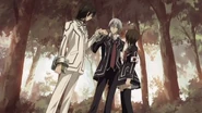 She then leaves, and she thinks about her past, saying that she has little memory of her childhood, but she remembers that Kaname took her to Kaien Cross, who then took her in as his daughter. She encounters Kaname and another night class student, Takuma, who thank her for her disciplinary work. After Yuki leaves, Kaname and Takuma discuss the loyalty of the other vampires to Kaname, the Pureblood. According to Takuma, the other vampires have learned to like their new lives, but only follow the school rules because of Kaname. Ichijo continues by warning Kaname that even with Kaname being a Pureblood, there are still vampires that will listen to others.